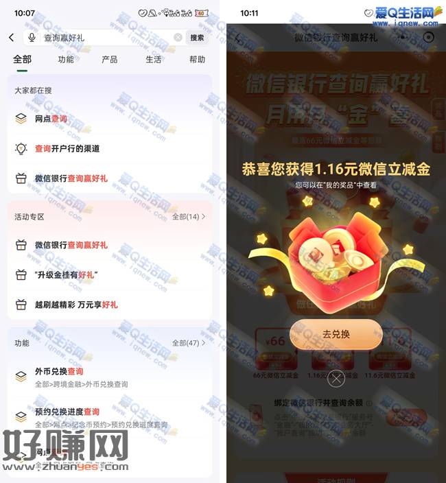 2.邮储银行APP-搜【查询赢好礼】-微信银行查询赢好礼-点进去领取奖励兑换即可