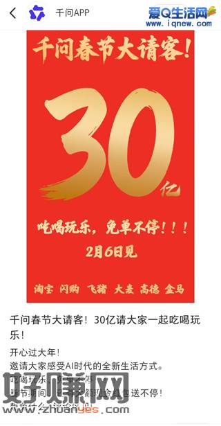 千问APP-2月6日开始有瓜分30亿元免单活动