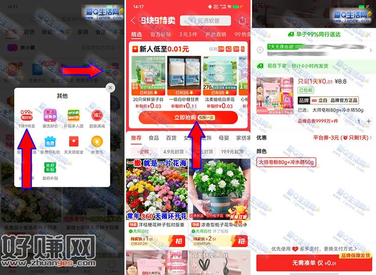 拼多多APP-首页点【其他】展开-9块9元特卖-弹3元无门槛-立即抢购去自己选东西买