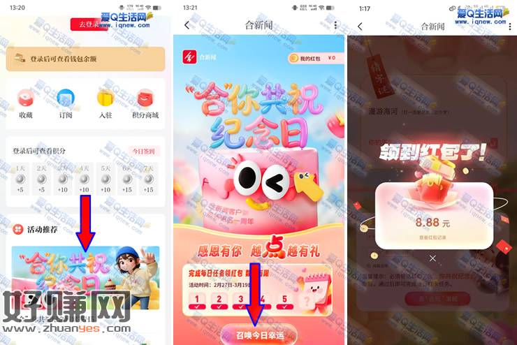 合新闻APP-我的-下拉【合你共祝纪念日】-召唤今日幸运-完成任务一、任务二后领取红包