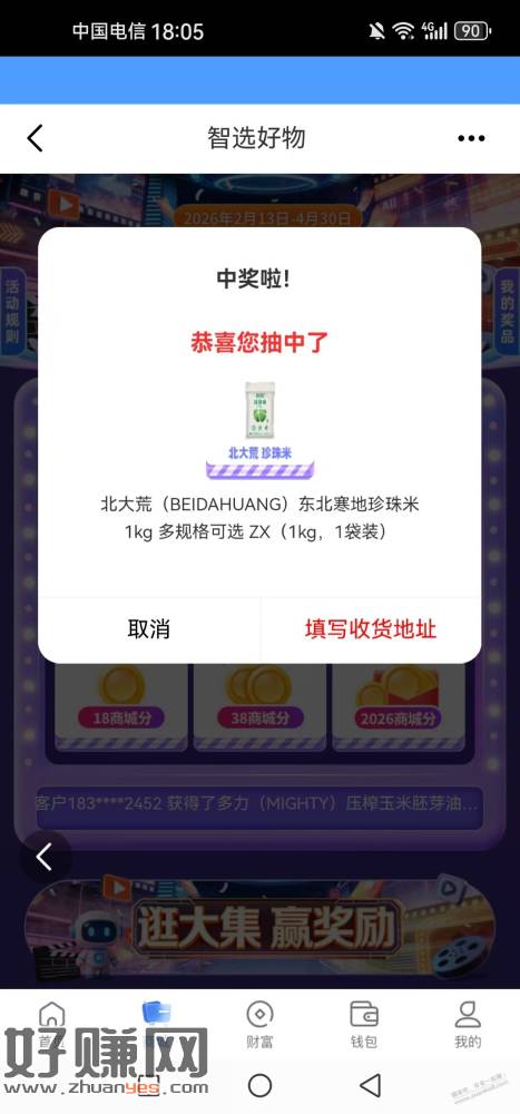 和包app,底部,商城,第一个轮播图,智选好物那个。有一个号中了2次实物