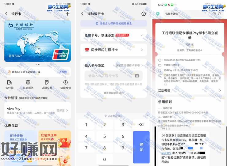 安卓手机-找到手机钱包-添加银行卡-绑上工行卡-自动到账5元银联券