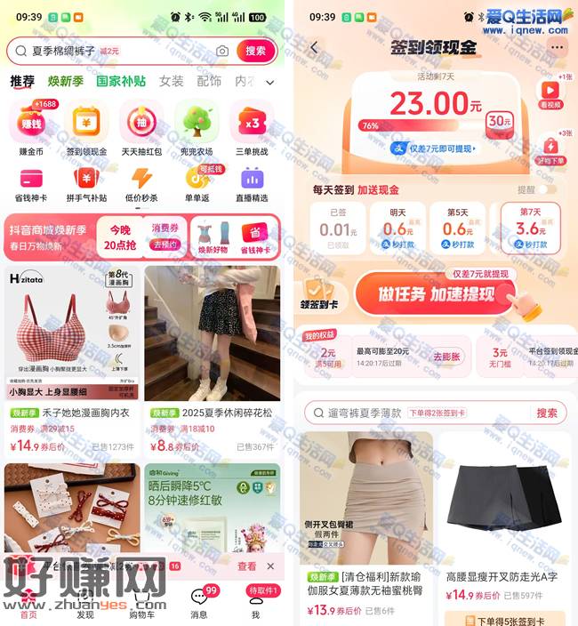 抖音商城app-首页顶部【签到领现金】做任务 加速提现,活动期间内满30元可以提现到支付宝