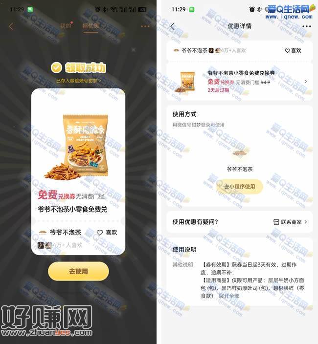 微信摇一摇 亲测中爷爷不泡茶小零食免单券