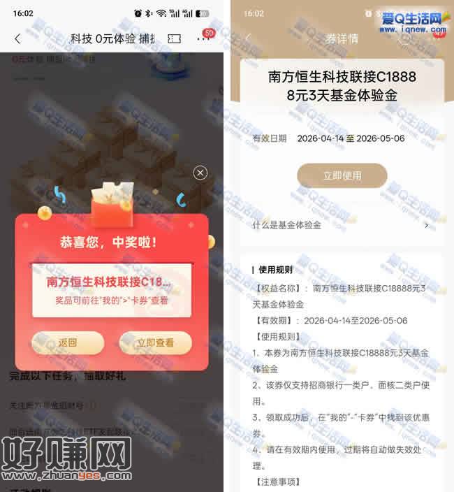 招行完成简单任务 抽体验金或现金红包秒到