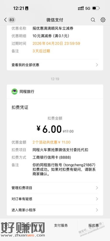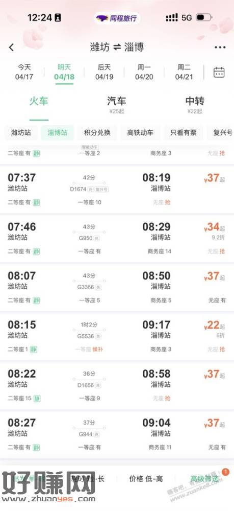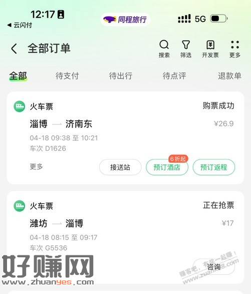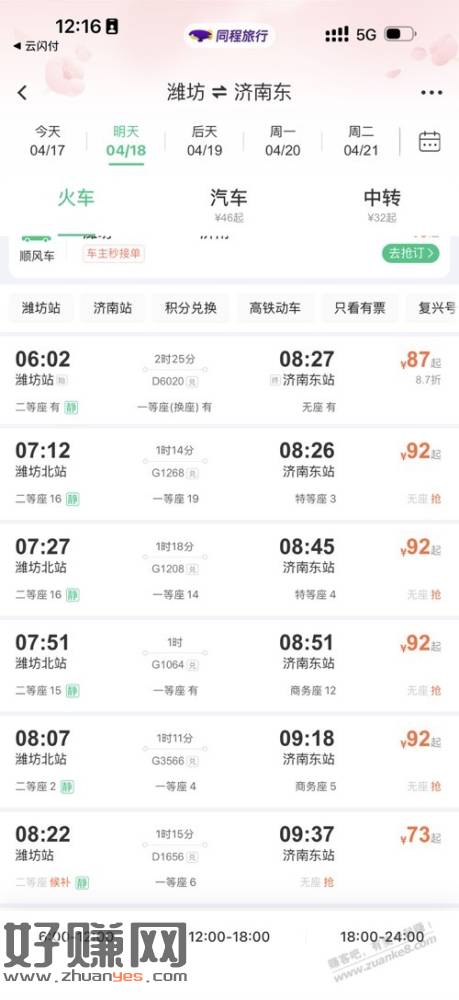 今天想买潍坊-济南东站的火车票,原本是计划9点多73比较便宜的那趟,显示没票了同程提示可以中间换车。但是直接一起购买部分优惠券不支持使用,所以想着分段购买,第一段分段买的时候发现还有打6折的车次,时间基本上差不多,就下单了抢票用了-5的火车票券。第二段有两个车次相差了10分钟,黑鲸会员有个21-20一等座券,想着买一等座,发现两趟车一个一等座是原价58,一个打了折是47,果断选了47的那一趟,用完券到手27。两段一共花费27+17=44,相比直接购买大部分92的车次几乎省了一半,还可以坐一趟一等座,很值了